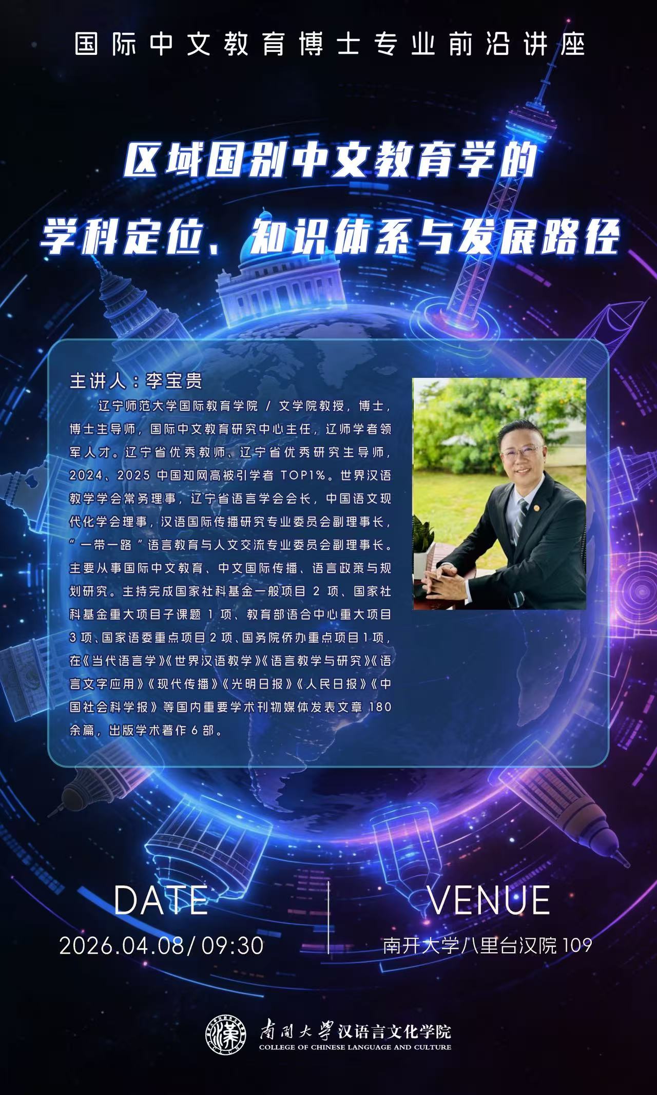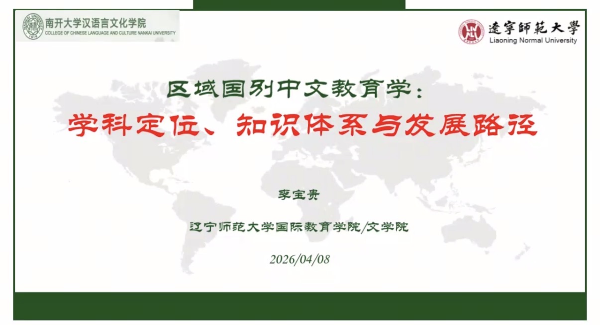 (通讯员 刘一然)2026年4月8日上午9:30,由南开大学汉语言文化学院主办的“国际中文教育博士专业前沿讲座”,在南开大学八里台汉院109室及线上同步举行。本次讲座特邀国际中文教育领域权威专家、辽宁师范大学李宝贵教授主讲,主题为“区域国别中文教育学的学科定位、知识体系与发展路径”,吸引了学院师生及相关领域研究者共同参与交流。