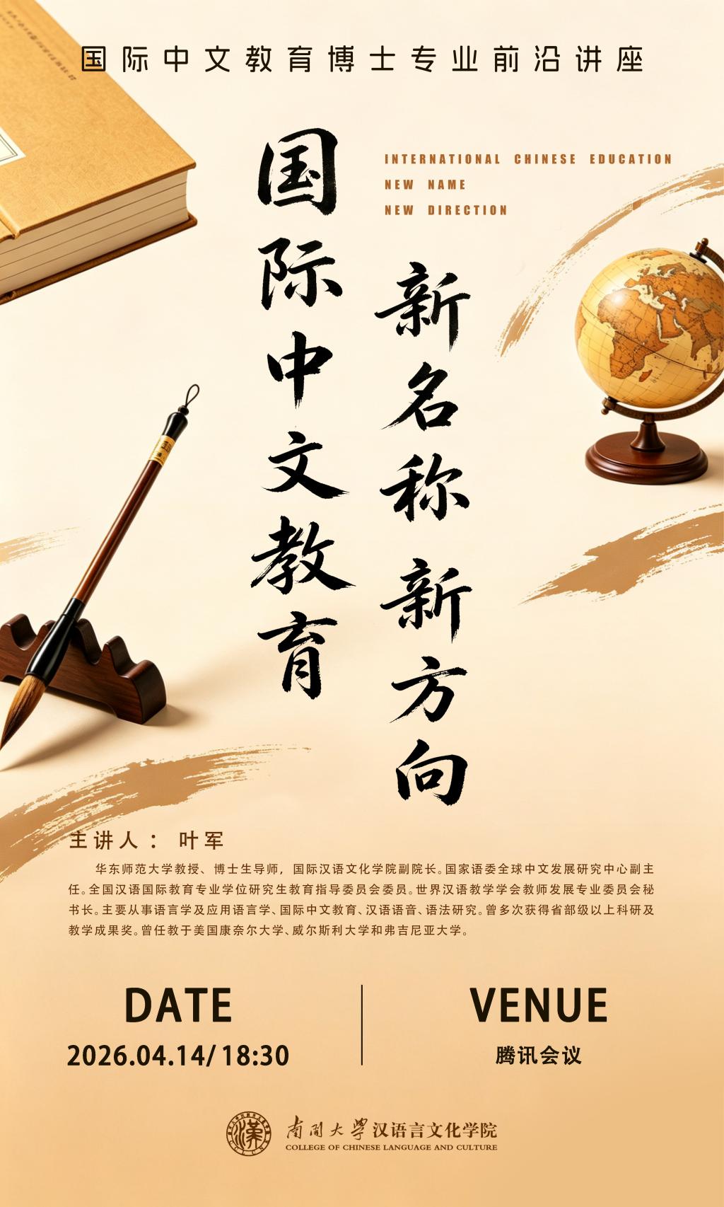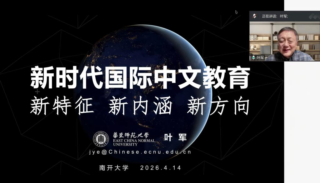 (通讯员 王玉会)2026年4月14日晚,南开大学汉语言文化学院“国际中文教育博士专业前沿讲座”,特邀华东师范大学叶军教授主讲“新时代国际中文教育:新名称·新方向”。讲座由汉语言文化学院院长刘佳主持,研究生培养部主任王帅及学院本、硕、博同学共同参与。